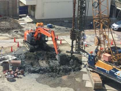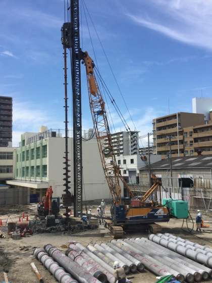 先週杭打ち機材の搬入があった工事現場では、7月9日(月)に試験堀りがありました。