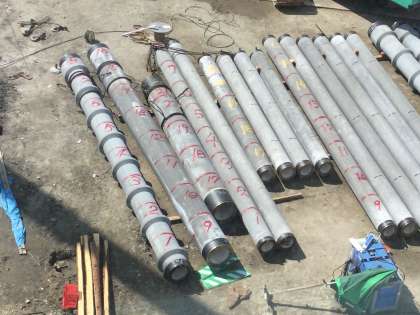 試掘に向けて、運び込まれた太い杭が並べられ、それぞれの杭に1〜8、9〜16、17〜21と数字が打たれてあります。細めの杭にも番号が打たれてありました。おそらくメートルの表示でしょうね。