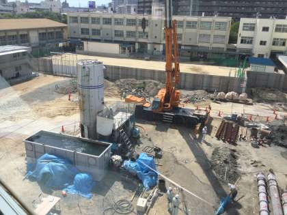 またグランド中央部に設置された、コンクリートを作るプラントも稼働し始めました。杭施行の下準備がいっきに動き始めました。