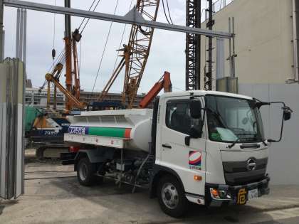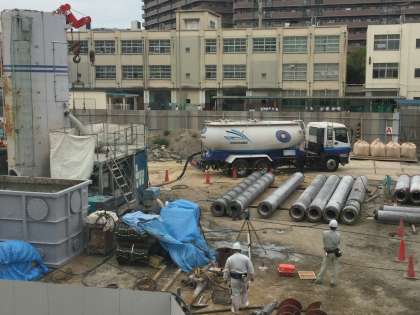 本格的な杭施行に向けて、工事の後方支援の車両も多く見かけます。地中に埋めた鉄筋コンクリート製の杭に、コンクリートを注入するためのプラントが動いています。このプラントに使う粉末のセメントを運ぶ大きな運搬車も見かけます。(上の写真)