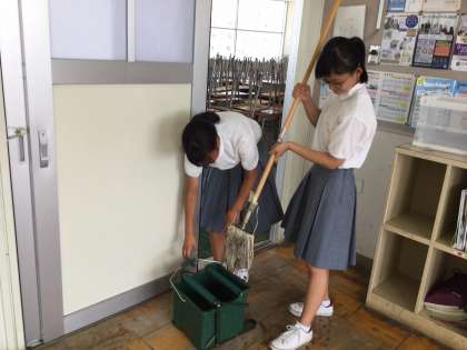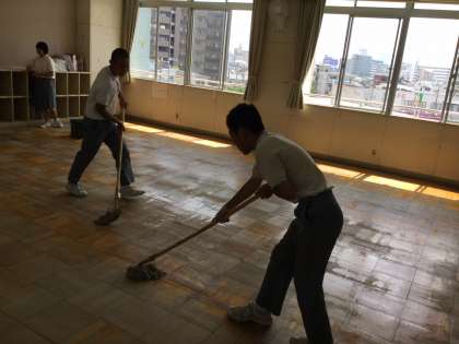 最初に掃き掃除と、モップでのふき掃除をして教室の1学期間の汚れを取り除きました。