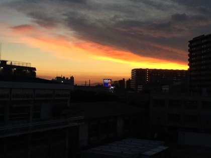 猛暑の昼間の終焉を告げるように薄暗くなってきたとき、ぱ〜と西の空が赤く染まってきました。赤い色や橙色にそして黄色い色がグラデーションン様に、建物のかげからから吹き出すように染まっていきました。