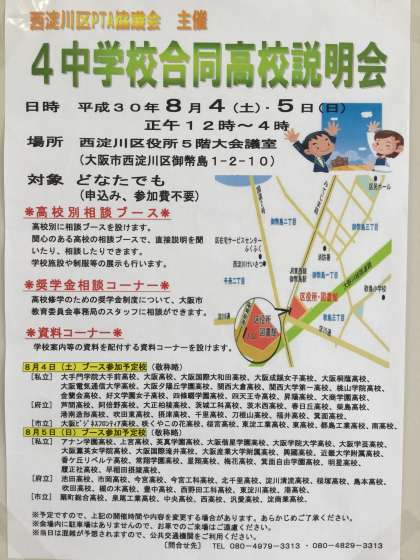 西淀川区PTA協議会主催の「4中学校合同高校説明会」が、8月4日(土)5日(日)に西淀川区役所5階大会議室にて、大阪府内の私立・公立の高等学校から参加していただきます。各参加校の相談ブースでは学校の事についていろいろと尋ねることが出来ます。ぜひとも参加してください。