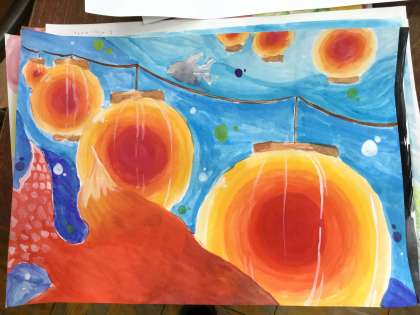 お題をいただいて1時間と、短時間で書き上げる取組をしていました。今日を「音楽会」のテーマで、ピアノや楽譜が飛び交う、軽やかな絵をかいていました。傍らには先日書いた「夏祭り」の絵がありました。吊り下げられた提灯の間を、金魚がすいすい泳ぐ様が見て取れました。