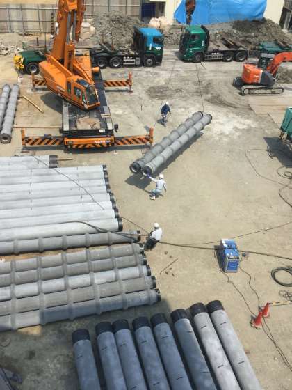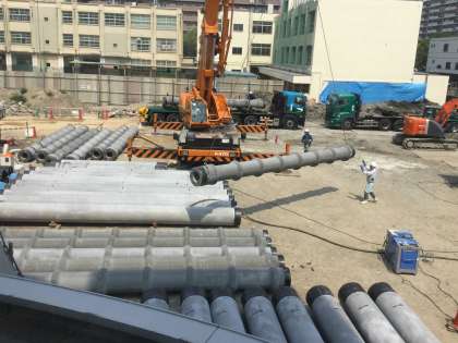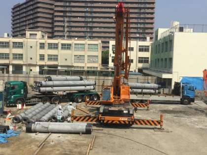 7月9日の試験堀を踏まえて、杭打ちが始まりました。丁度梅雨明け時期で、以後猛暑に負けじと、工事現場では毎日杭施行が行われています。