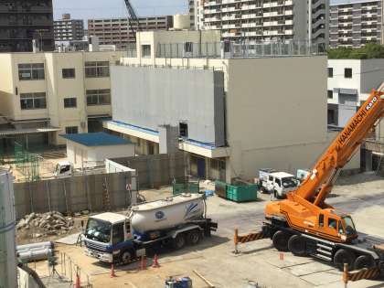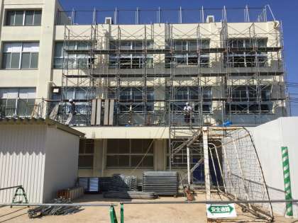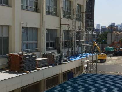 外部サッシ改修工事は、8月24日までに終わり、新学期は新しい窓枠になる予定です。
