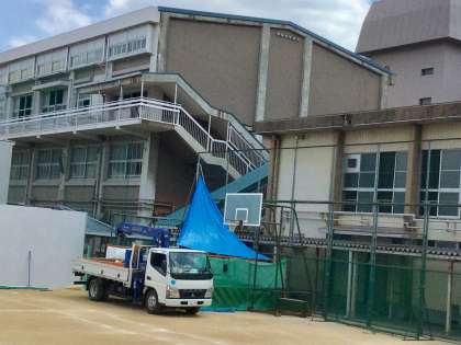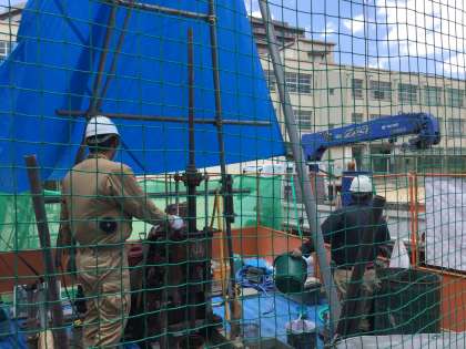 歌島中学校では新校舎完成後の近い時期に、プールや格技室の建設を予定しています。設計に先立ち、地質調査(ボーリング作業)を、本日8月7日(火)より8月10日(金)まで行います。