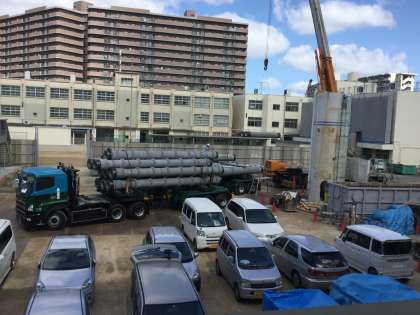 今日は朝から大勢の工事関係者が現場に集まり、杭工事が再開となりました。現場にはコンクリート製品やセメント・重機の燃料の納品があり、トレーラー、タンクローリーなどがひっきりなしに出入りしています。