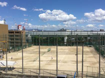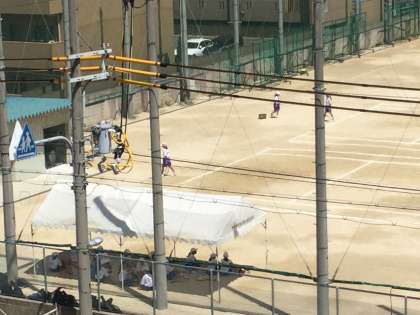空を見上げるとモクモクと雲が湧き上がっています。第2グラウンドでの部活動中のテニス部員も、テントの中で休憩をしながらの練習となっています。