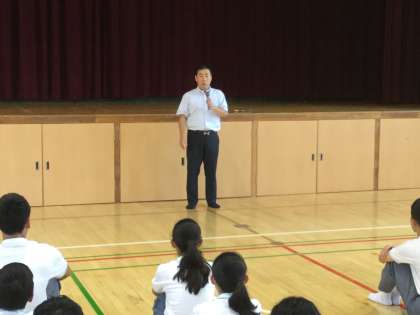 校長先生からのお話は、昨日24時間テレビの放送があり、ハンディキャップを背負った人から多く人が感動を得ました。それは目の前のことを精一杯、自分自身との戦いがあったから感動が生まれました。皆さんも体育大会や合唱コンクールを一生懸命頑張るとともに、できない人をカバーして周りの人を感動させてください、と話されました。