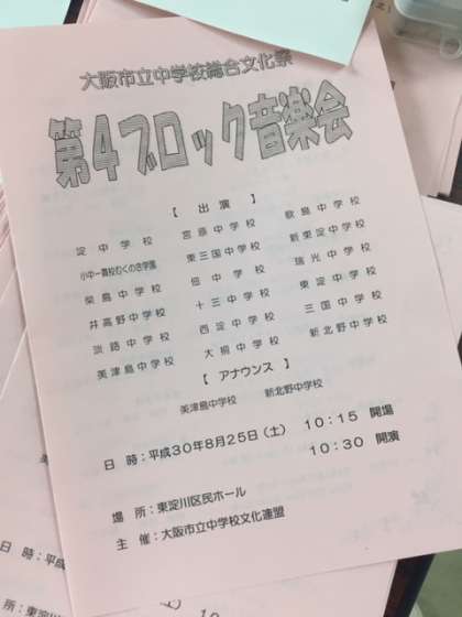8月25日(土)に東淀川区民ホールにて、4ブロックの音楽会が開催されました。本校吹奏楽部が参加し、「鷲の舞うところ」と「魔法にかけられて」を演奏しました。
