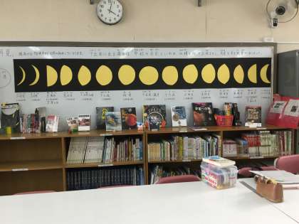 図書室の今月の掲示には、月の満ち欠けが表現されていました。新月→上弦の月→満月→下弦の月→新月 と黒色画用紙に黄色い色画用紙が貼り付けられていました。