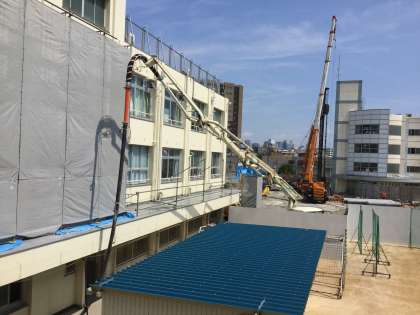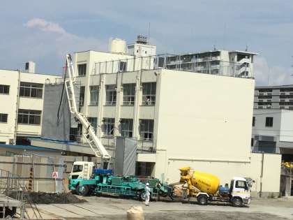 コンクリートミキサー車が次から次とやってきては、ポンプ車の後部にある投入口に入れていました。コンクリートをお腹に貯めこんだポンプ車は、うなりをあげホースをよじりながら、作業現場にコンクリートを運んでいました。建物に覆いがあり見ることはできませんでしたが、忙しいコンクリート打設だったかと思います。