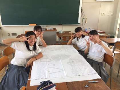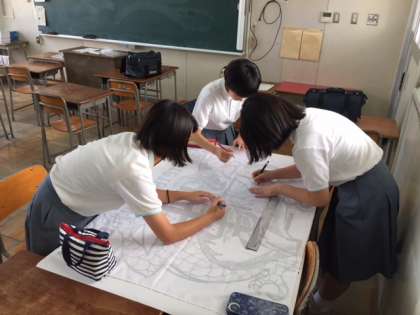 3年生では、昨日の放課後、各クラスで学級旗の下書きをしました。
