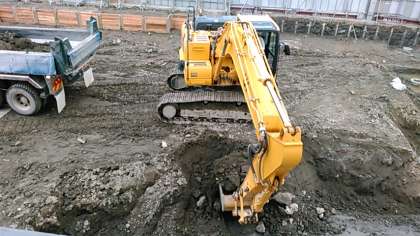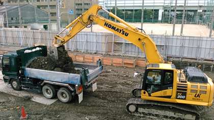 昨日と同様に、掘り出された土はダンプカーに積み込まれ、工事現場の中央にある仮置き場に運ばれました。昨日よりも、残土の高さが高くなりました。