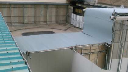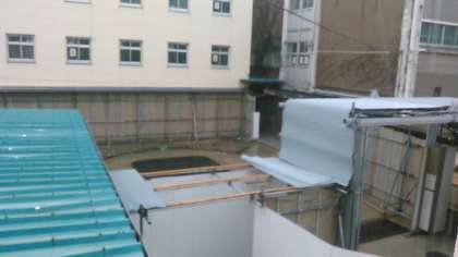9月4日の台風21号の通過の際に、工事現場の横にある渡り廊下の屋根が吹き飛ばされました。