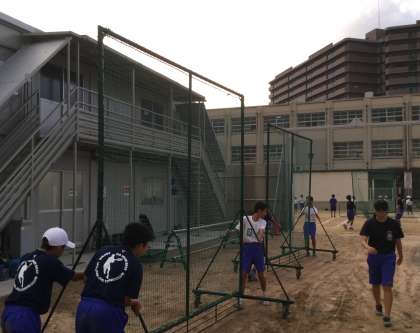 体育大会が近付くにつれて、ぐグランド整備等が進められています。昨日も夕方に第2グラウンドに置いてある、ハンドボールゴールや移動式の防球ネットが多数、運動部員によって第1グラウンドに運び込まれました。