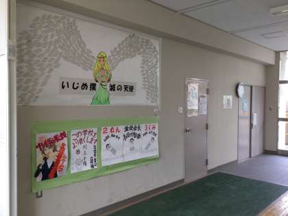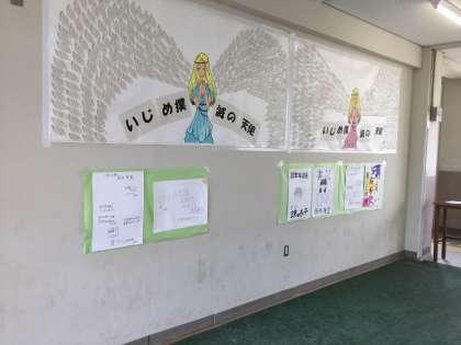 1号館1階の玄関通路の両側壁面の、生徒作品「いじめ撲滅の天使」に寄り添うように、立候補者のポスターが掲示されています。同じく3号館1階の中廊下にも掲示されています。