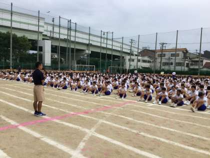 体育委員代表の「閉会式の隊形に集合します。全員集合」で、閉会式に向けて座席から一気に駆けてきて整列しています。