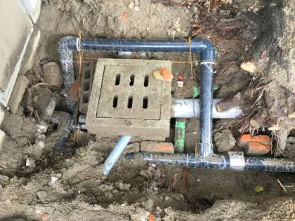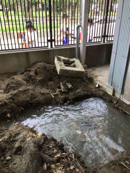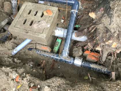 この場所は、重機が入ることもできず全て手掘りとなりました。地下深く排水用の塩ビ管や木の根が絡み付いており、難易度の高い工事となりました。雨の中作業員さんの頑張りで、破損していた管の迂回路(マスを囲んでいる紺色のパイプ)を作っていただき、昨日遅い時間についに補修完了となりました。