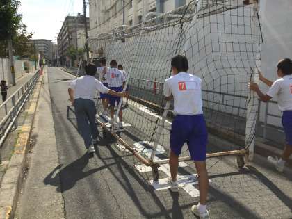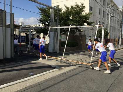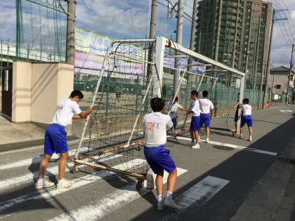 第2グランドで使用していたサッカーゴール1組が、サッカー部員にグランドから道路に出ていきます。1号館と幼稚園の間を通り、正門のゲートを開けていただき、3号館前の中庭にたどり着きました。