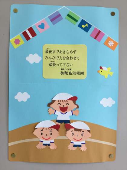 会場設営が終わり1号館に戻ってきますと、玄関ホールの掲示に、御幣島幼稚園からいただいたかわいい手作りの祝辞がお出迎え。「最後まであきらめず みんなで力を合わせて 頑張ってください」とありました。