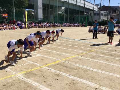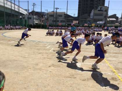 男子生徒がフライングをして、3mバックからスタートをしました。この生徒は他の生徒をどんどん抜いていき、2着でゴールとなりました。