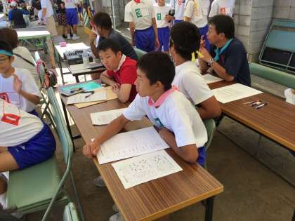 本部席では放送の係がアナウンスをしています。また記録係は得点集計を計算しています。