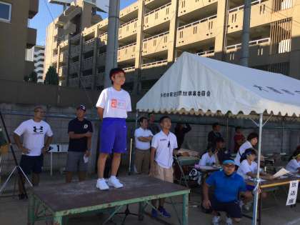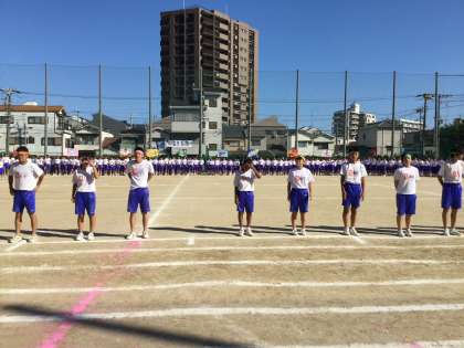 体育委員の「閉会式の隊形に集合します。全員集合」と。初めに体育委員が横一線に整列し、全員が後ろに続きました。