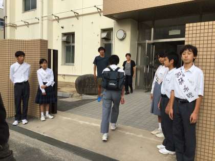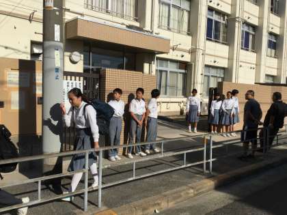昨日・今日の登校時に、後期生徒会役員選挙立候補者が、選挙用のタスキをかけて玄関前に並んでいました。