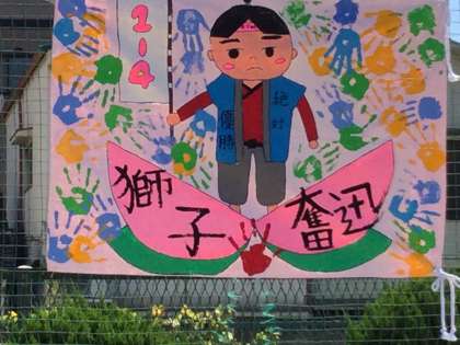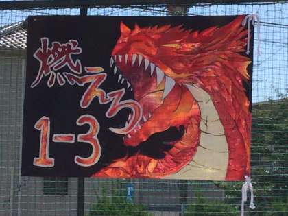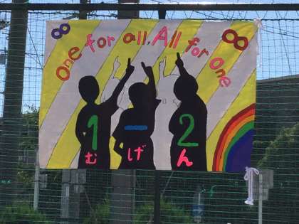 体育大会の開会式で使用後に、生徒席の後ろの防球ネットに掲示されていました。