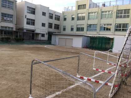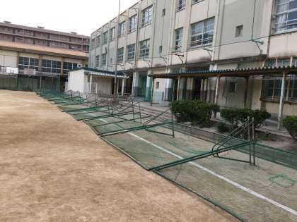 毎週末の恒例の行事のように、台風襲撃に備えてグラウンドでは防球ネットやハンドボールゴールが伏せられていました。