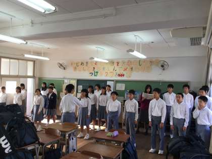 教習用机を黒板前に集めて後方に大きなスペースを作って、8時前でしたがクラスの大半が揃っての練習でした。黒板脇の机に置いたCDシステムから流れる伴奏に合わせての合唱です。