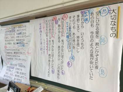 課題曲「大切なもの」の歌詞が拡大して黒板の上に掲示されています。この紙面には「しっかりのばす」「どんどん強く」「息」と、具体的で解りやすいポイント書き込まれていました。担任の先生のアドバイスと相まって、生徒達は指示に従い大きな声で歌っていました。