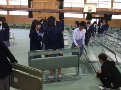 フロアーシートを敷き詰め、メジャーで計測しながら等間隔にイスを並べて会場設営が完了しました。生徒達の頑張りがあり時間内できれいに出来上がりました。設営終了後は真ん中に集まって、クラスの取組の話し合いを進めていました。