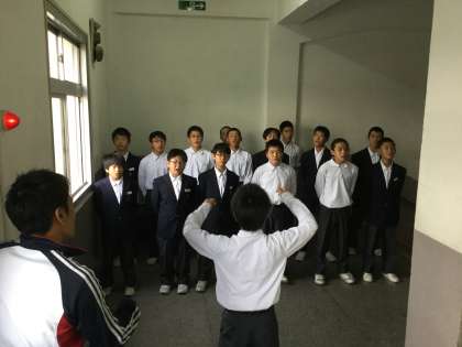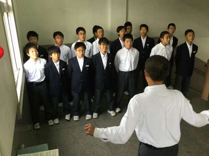 1年1組では、男子生徒が階段横の廊下に整列して歌っていました。指揮者を見据えて、背筋を伸ばして大きな声で歌っていました。担任の先生からもアドバイスをもらっていました。