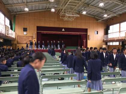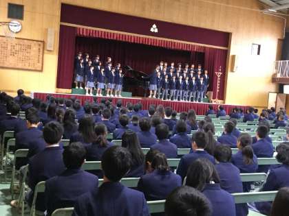 初めに音楽科の大村先生の指導で、2年生全員揃って課題曲「大切なもの」を歌いました。自分のクラスの座席から保護者席・司会者席の前を通って、階段を昇り舞台上の自分の位置につき、そしてクラス席へと戻る確認もしました。各クラス毎に自由曲を歌ってリハーサルを終わりました。
