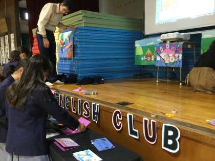 また舞台周りで、英語部の桃太郎劇の動画が、C−NETのマイクさんはじめ部員の手で立体的に展示されていました。