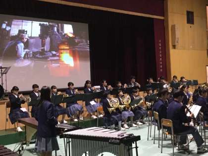 「鉄道唱歌でたどる東海道線の旅」では、鉄道マニアを名乗る部員が駅員さんに扮して曲の紹介をしていました。「富士山」や「村の鍛冶屋」等沿線の曲が多数演奏され、バックのスクリーンには曲に関しての映像も映し出されていました。
