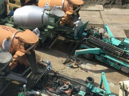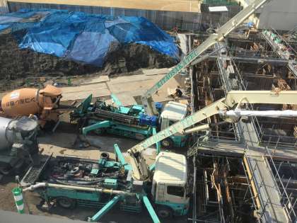 コンクリートミキサー車1台分の生コンクリートは、短時間でポンプ車が呑み込んでいきます。空となったミキサー車が出ていったら、すぐに待機していたミキサー車が列に入って流し込みとなりました。この車両の出入りが延々と繰り返しおこなわれていました。