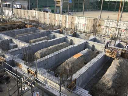 資材が運び出された後は、きれいなコンクリートの地中梁が、たくさんの長方形の枡を形成して並んでいました。今まで図面で見ていた部屋の配置が、現実の形で初めて現れました。