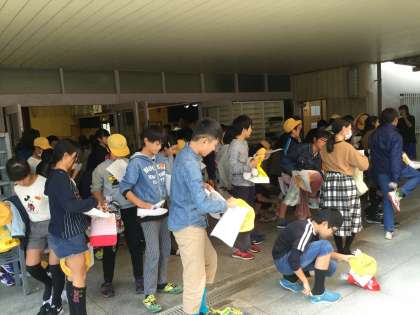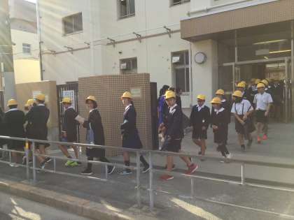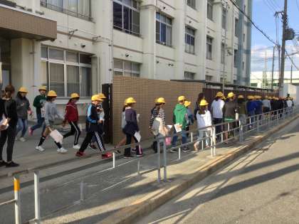 小学6年生の皆さん、歌島中学校の学校生活・部活動を見聞きしてどうでしたか。各小学校ごとに正門を出て、先生引率のもと小学校に戻っていくところです。皆さんお疲れ様でした。