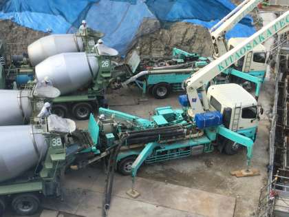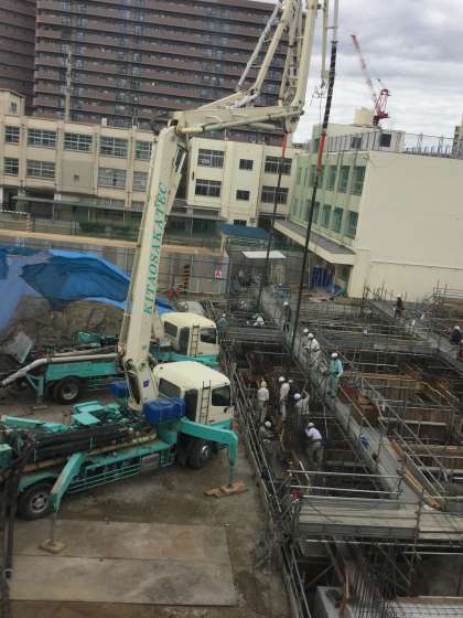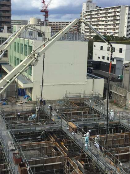 2台のポンプ車に吸い込まれた生コンクリートは、高く持ち上げられた後、ハイピッチで型枠の中に吐き出されていきました。