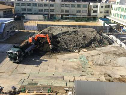 コンクリート杭打ち後に掘削された土が、工事現場中央部に小山のようにうず高く積み上げら、ブルーシートで覆われていました。