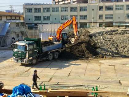 今回ブルーシートがめくられてショベルカーでダンプカーに載せられ、建設現場に何度も運び込まれました。