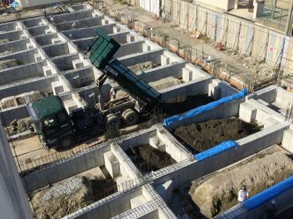 基礎コンクリートのマス目に、11月8日(木)から土の埋戻し作業が始まりました。