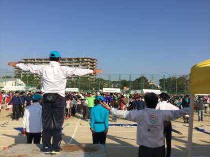 ラジオ体操で歌島中学校生が体操をしている場面です。