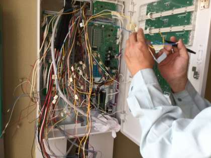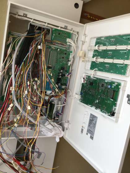 新しいものは、以前のものに比べてコンパクトな作りになっていました。ボックスの中はおびただしい配線と基板がびっしり並んでいました。我々の安全はこのハイテク商品に守られていることをつくづく感じさせられました。