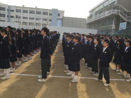 11月12日(月)の全校集会は、第1グラウンドで朝陽を浴びて行いました。