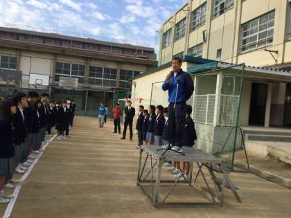 地域から歌島中学校生に対する、お褒めの言葉をたくさんいただきました。区役所からも苦情が少ないとのお話がありました。他人に言われて行うのでなく、今何をすべきか自分でしっかり考えて行ってください。頑張らない人は救われませんと話されました。
